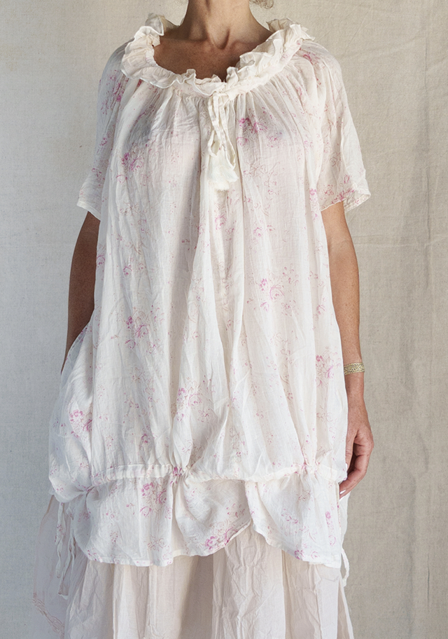 Matière : mélange 50% lin & 50% coton, avec sous-robe en organza de coton