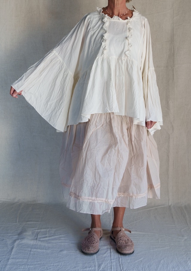 Légère et féminine, cette robe longue associe la douceur du lin et du coton à l’élégance d’une sous-robe en organza de coton délicatement doublée de dentelle. Sa coupe fluide et aérienne en fait une pièce idéale pour la belle saison, alliant confort et raffinement.