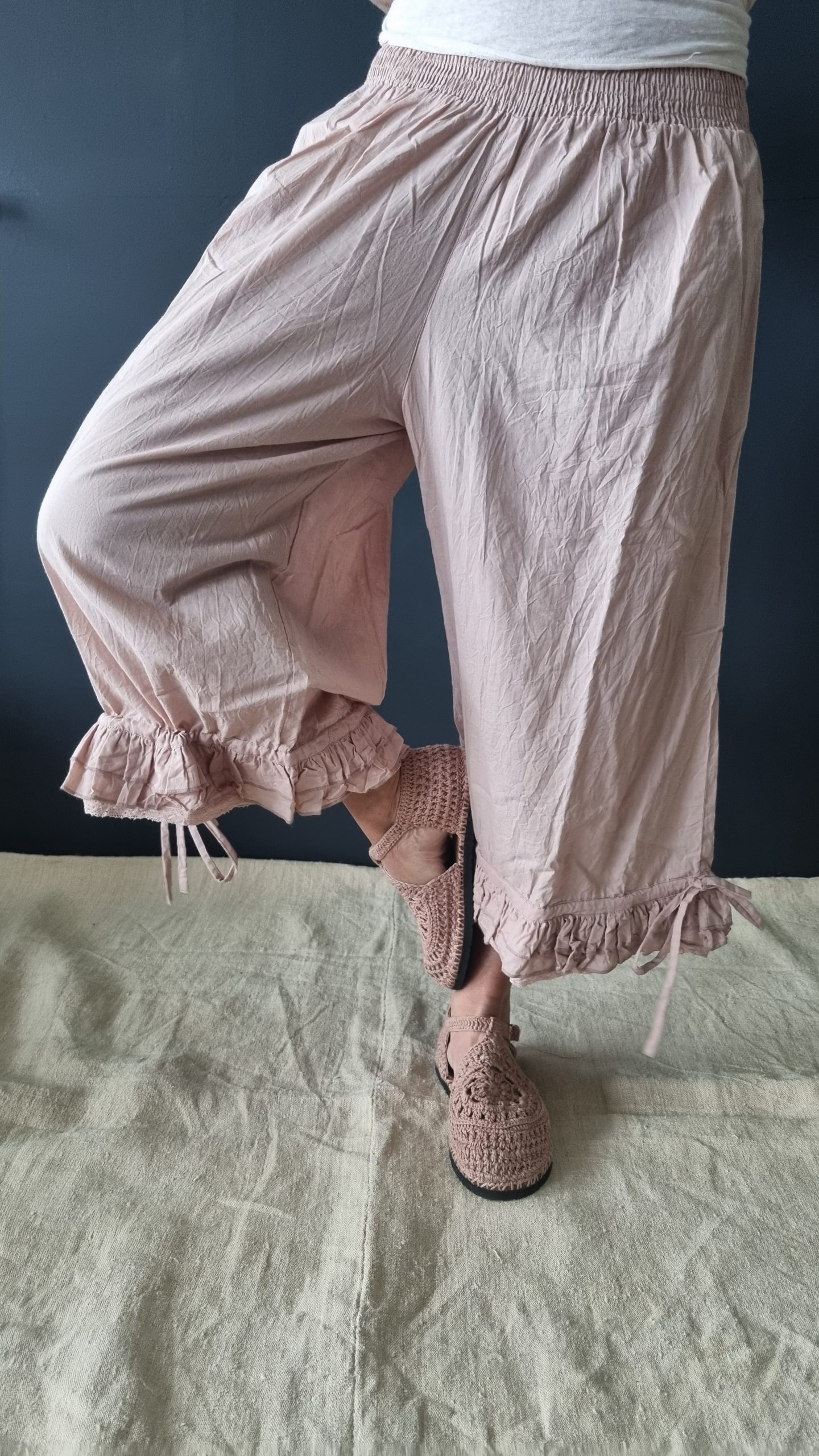 **Style & associations** : Ce pantalon s’associe à merveille avec une blouse en dentelle ou un top léger pour un look champêtre et romantique. Portez-le avec des sandales tressées ou des espadrilles pour un style bohème chic affirmé.