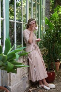 • Détails : encolure ronde à volants, patte de boutonnage sur le devant, manches courtes avec finition volantée, plis religieuse sur le devant et le dos